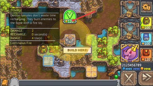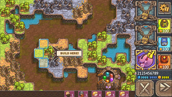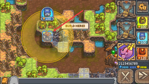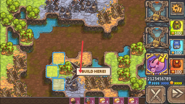 1、刚开局,优先建BUILD HERE来标记位置,选择蓝色的建筑用100金币开局,快速覆盖前方关键路径。