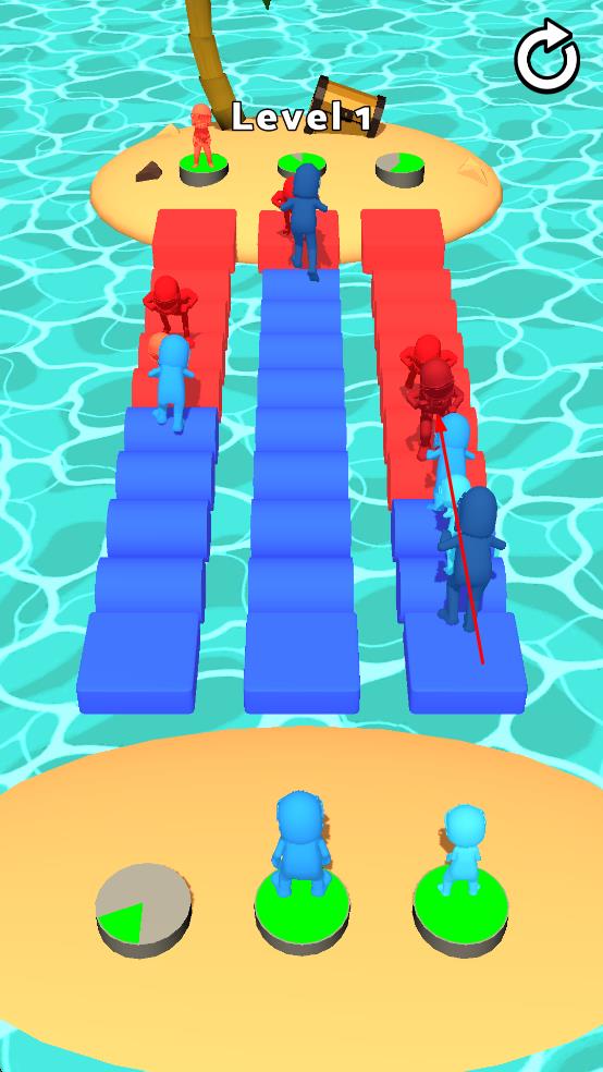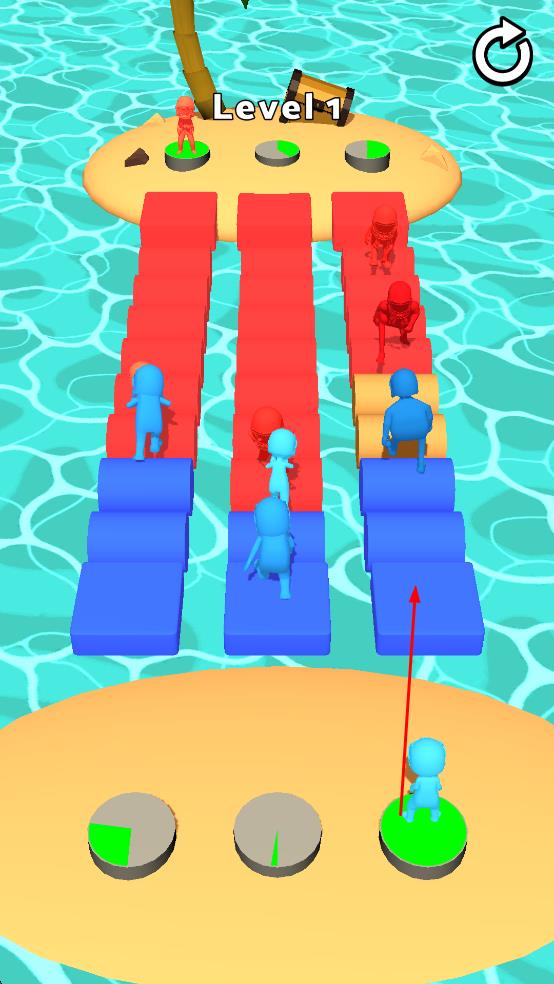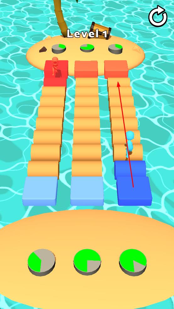 3、蓝色小人需成功抵达终点平台,完成关卡任务,随着关卡的进行,会出现更多的竞争对手和复杂的赛道。