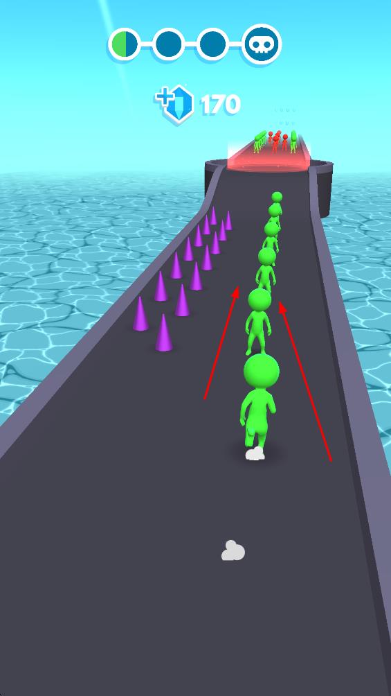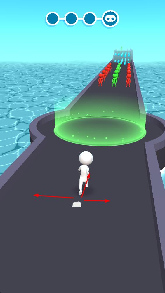 1、操控白色小人在赛道上移动,通过绿色光圈区域可使小人颜色变为绿色,同时注意避开其他颜色小人的干扰。