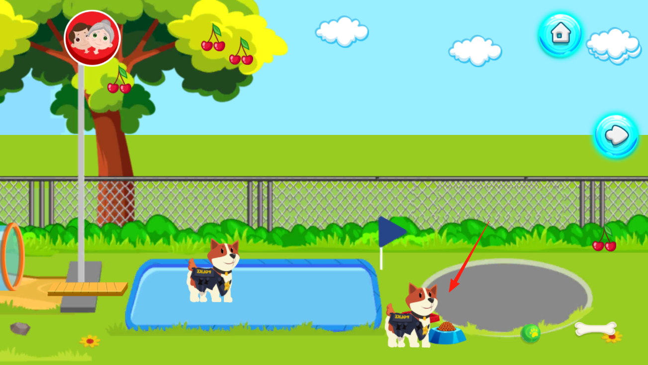 1、观察小狗动作互动喂食,点击食物盆投喂小狗,提升亲密度,体验宠物互动机制。