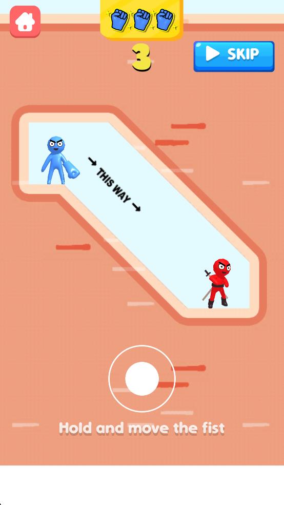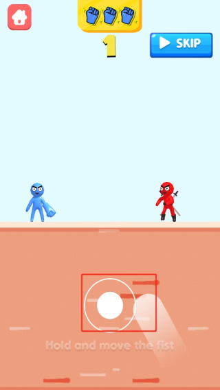 1、长按并拖动屏幕中白色圆圈,控制蓝色角色拳头方向,瞄准红色敌人,调整力度与角度,准备出击。