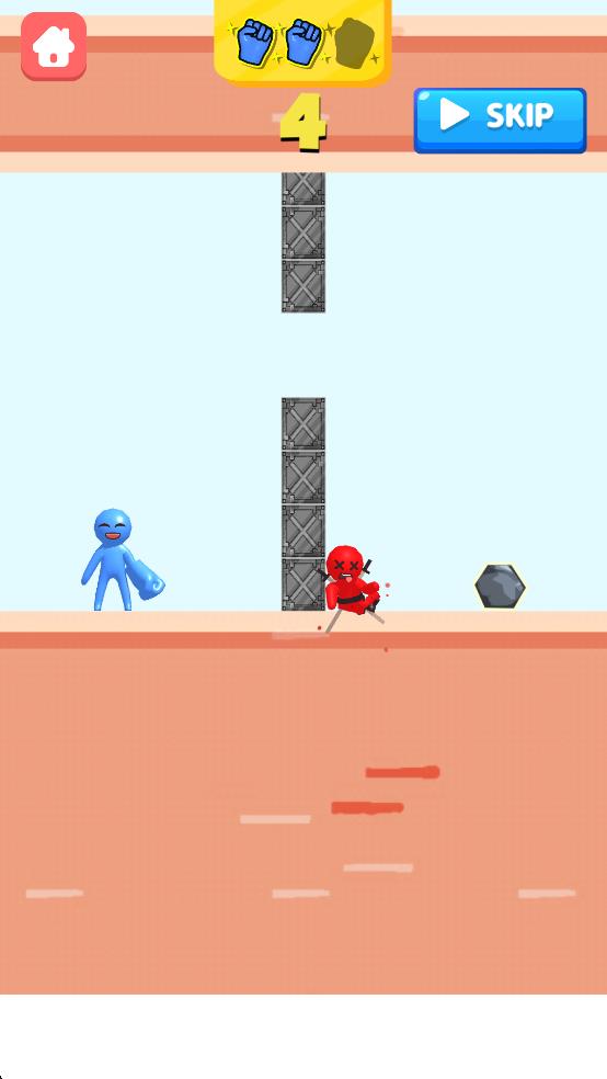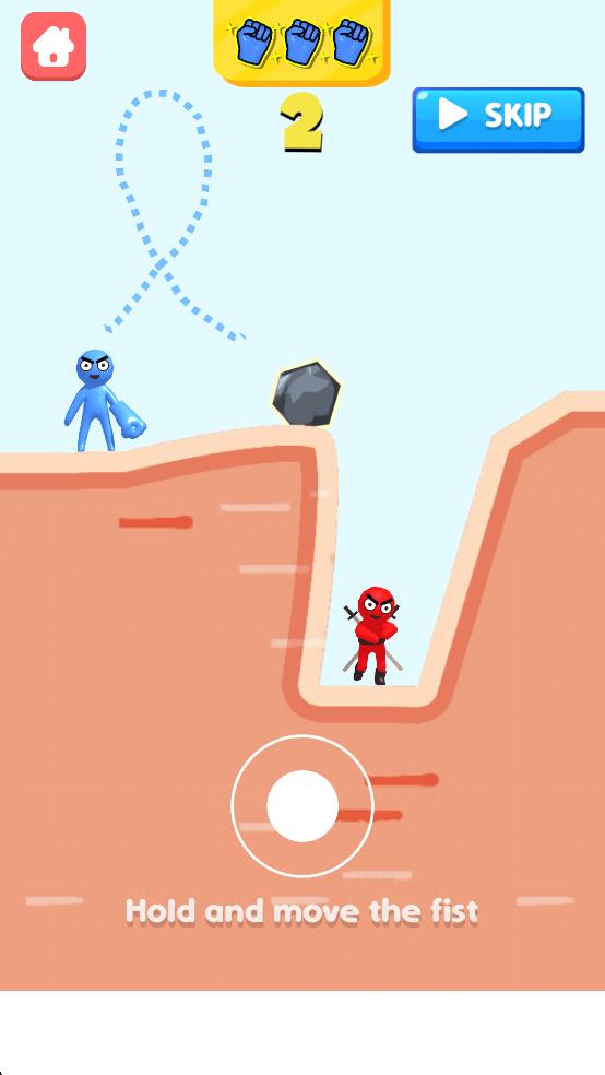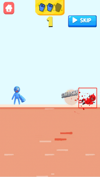 2、释放拖动的拳头,让蓝色角色挥拳攻击红色敌人,借助拳头冲击力,将敌人击飞,确保攻击命中要害。