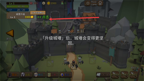 1、根据开局的提示点击,点击升级城墙,会变得坚固,需要优先加固城墙,提升防御耐久。