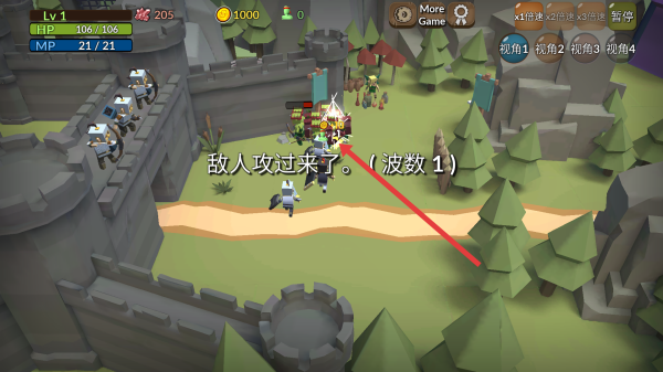 2、提示有敌人第一波来袭时,派近战兵持盾抗伤害,远程兵弓箭后排输出,英雄放中路补伤害。