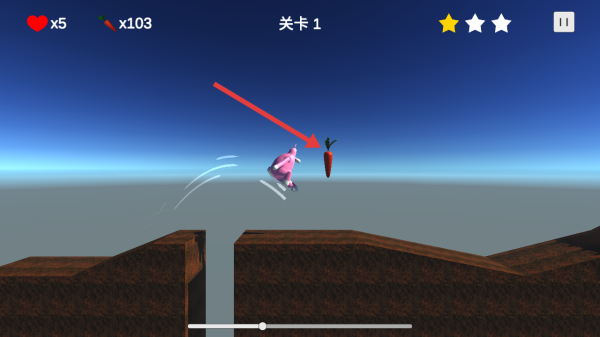 2、关卡1中,通过虚拟按键/操作控制兔子跳跃,跨越地形缺口,收集空中悬浮胡萝卜,留意左上角血量与辣椒道具。