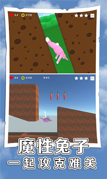 1、单兔操控挑战:用摇杆控制兔子移动,点击跳跃键跨越小障碍,长按可跳得更高,注意落地角度歪了会打滑摔向陷阱,考验手眼协调与耐心。