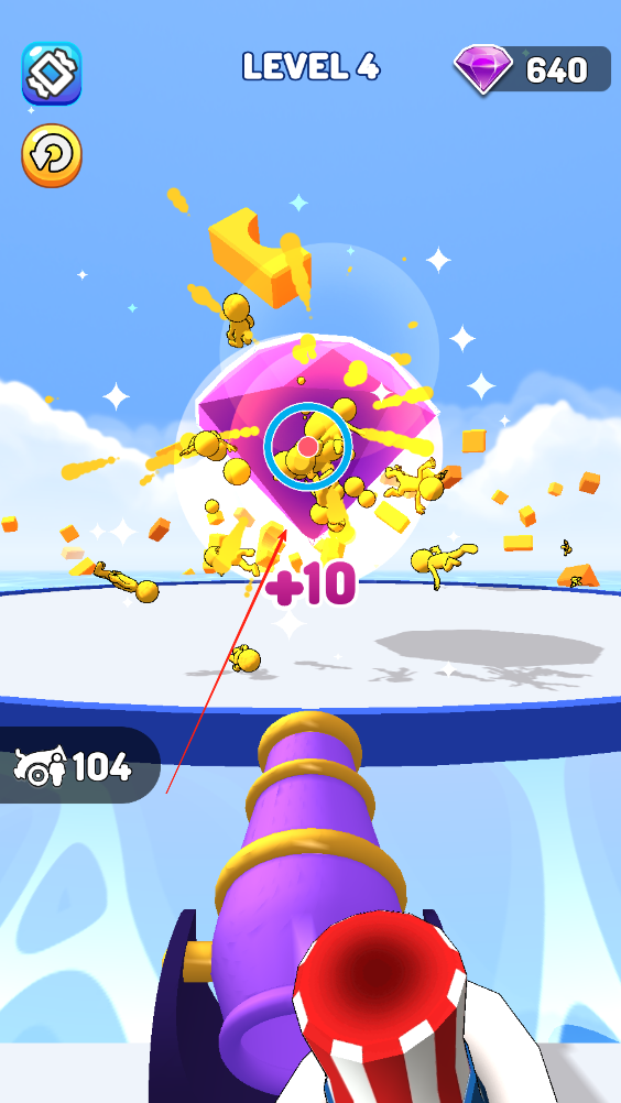 3、收集完的小人会全部钻进大炮,大炮对准前方的建筑,用小人把面前的建筑全部摧毁,摧毁完之后会出现一颗大钻石,用剩余的小人攻击钻石,即可获得钻石奖励。