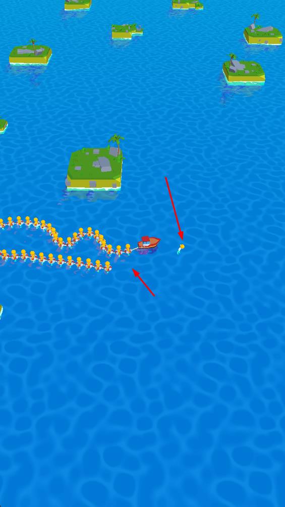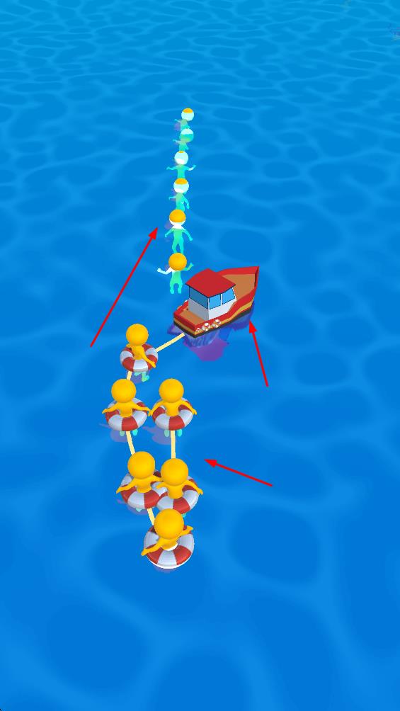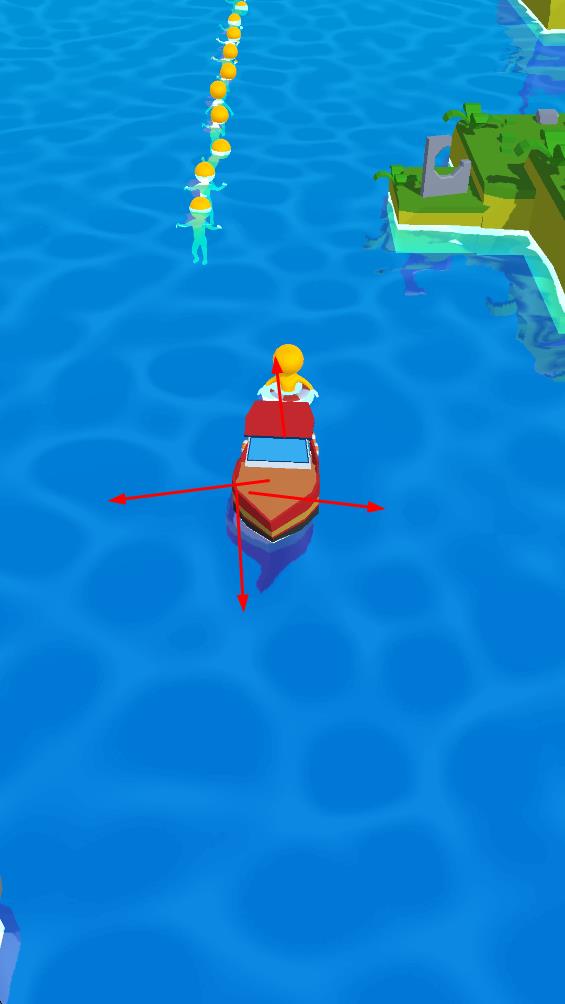 1、操控红色小船在蓝色水域中移动,船上有黄色小人,需引导小船在水域中航行,收集其他黄色小人。