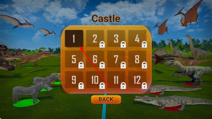 1、进入界面,会看到关卡选择界面,点击关卡1,进入战斗准备界面,左侧是可选择的动物列表,每个动物下方有对应的数值。