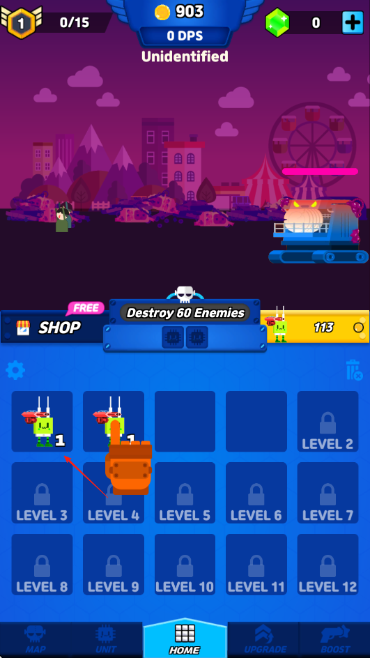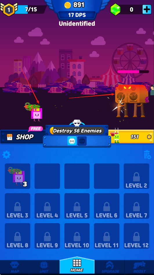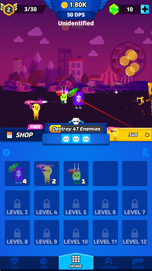 2、合成后的电子产品,将其拖动到场景内,让电子产品攻击怪物,获得金币,获得的金币可以购买低级的电子产品。