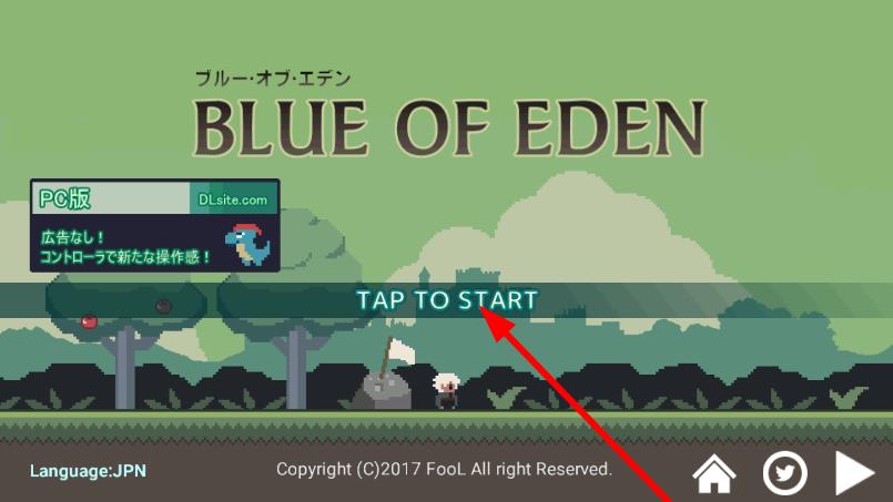 1、游戏初始界面显示BLUE OF EDEN标题,点击TAP TO START,进入开启像素风冒险。