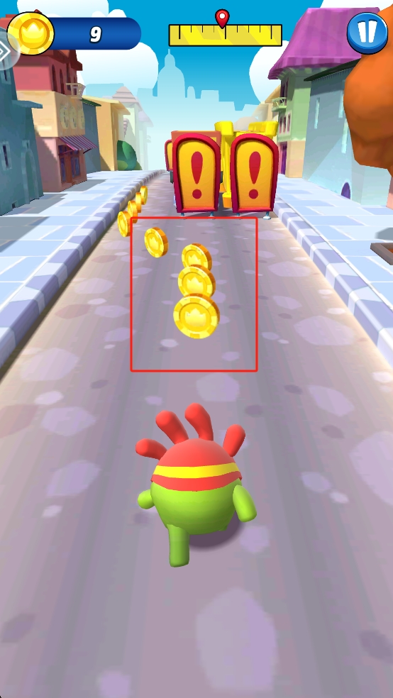 2、在跑酷过程中需要留意前方道路上的金币,尽量左右移动小怪物,收集沿途金币,增加金币数量。