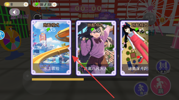 4、进入模式选择界面,根据喜好点击水上冒险等跑酷模式。