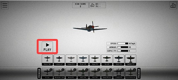 1、进入游戏后选择一架二战时的飞机型号,点击play开始游戏。