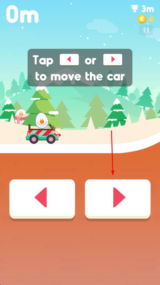 1、进入游戏后,面对雪山赛道,点击右箭头让鸡蛋车前进,左箭头扭转车辆避开障碍,在保持平衡中开启跑酷之旅。