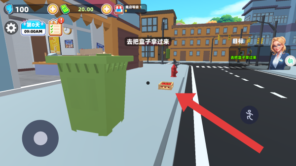 1、根据目标提示:去把盒子拿过来,画面中还有绿色垃圾桶、街道场景,呈现的是初始关卡的任务指引场景,属于模拟生活或任务执行类内容。