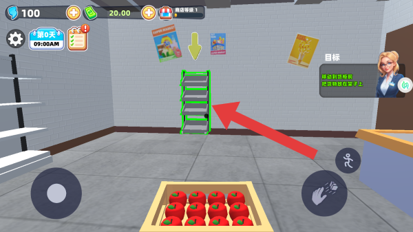 2、目标:将全部物品放到货架上,画面中有放满红苹果的箱子、空货架、墙面挂着的物品海报等,呈现的是初始关卡中整理货架的任务场景。