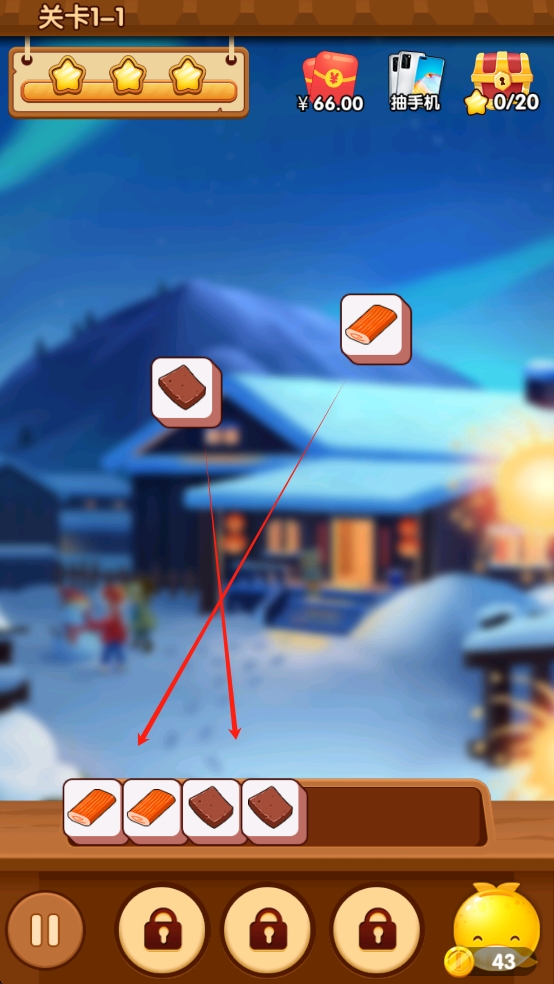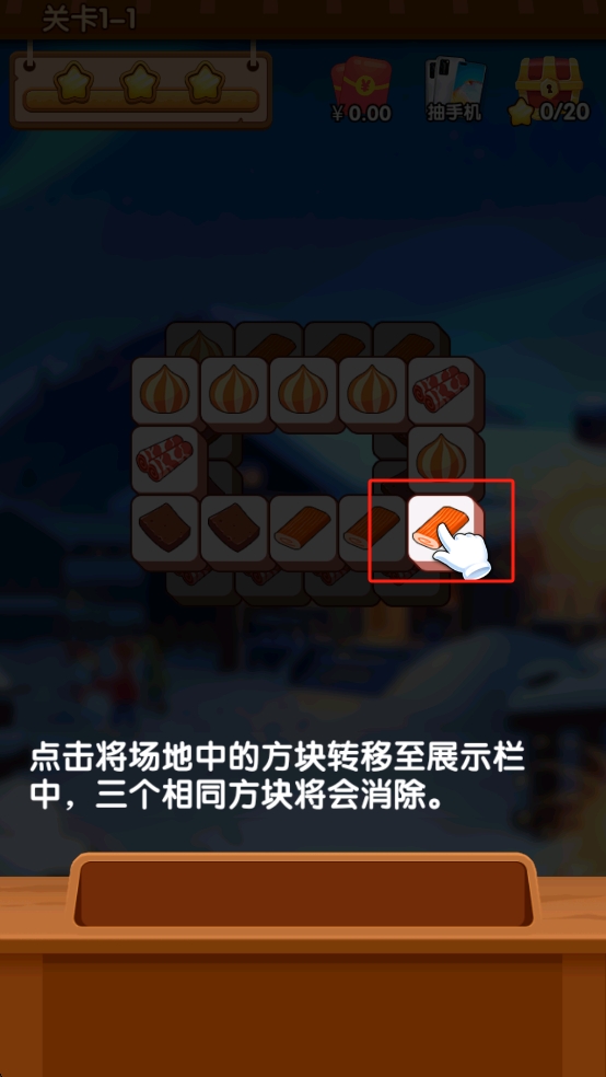 1、根据提示点击场地里带手指标识的方块,把它移到下方展示栏,凑够三个相同方块就能消除。