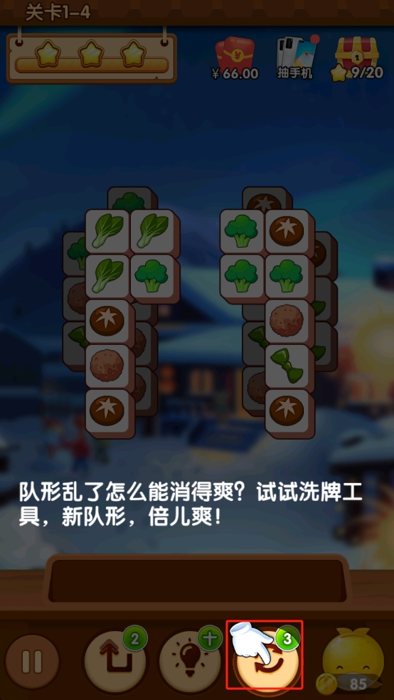 3、遇到队形乱的提示,点击下方带数字3的洗牌工具按钮,打乱方块重新排列,创造更多消除机会。