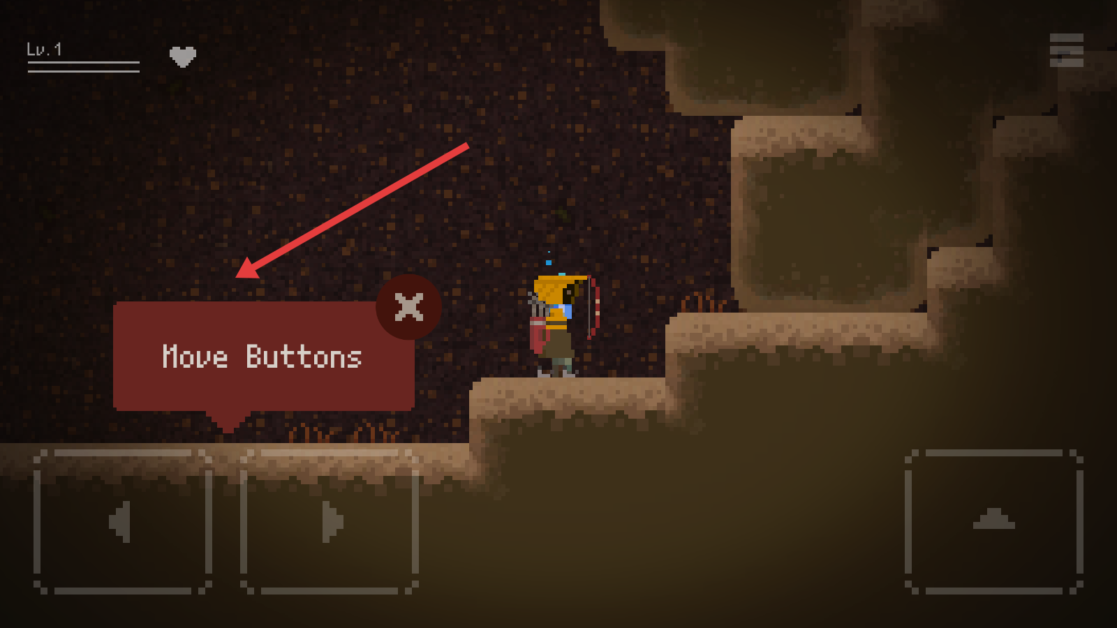 2、依据Move Buttons提示,用下方左右按键操控黄衣持弓角色,在洞穴地形行走、攀爬,探索路径避障碍。