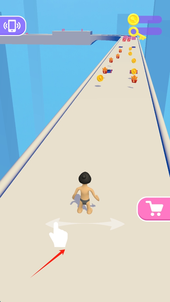 1、进入游戏,操控角色在跑道上开始跑酷,沿途收集金币和钥匙,为后续游戏积累资源。