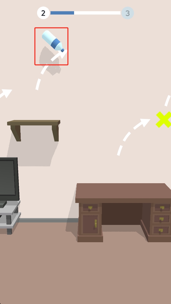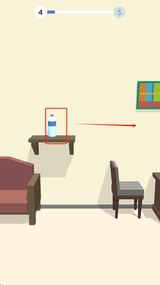 1、观察瓶子在桌上的位置,点击屏幕触发弹射,让瓶子沿箭头轨迹飞,避开沙发、椅子等家具,朝着目标路径推进。