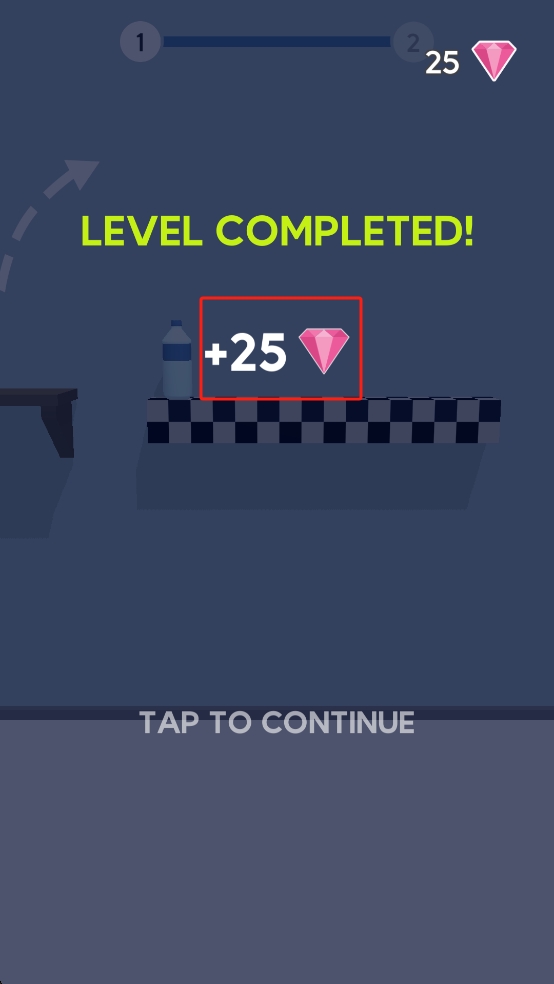 3、关卡完成后,界面显示获得25钻石奖励,点击屏幕继续,进入下一关挑战新的弹射路线。