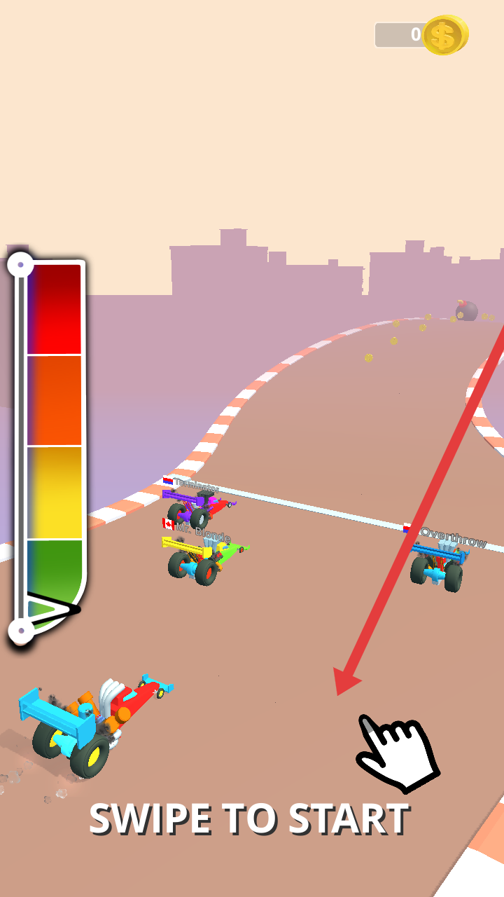 1、滑动屏幕触发SWIPE TO START,开启赛车比赛,进入赛道后需做好起步准备,通关滑动屏幕进行控制。