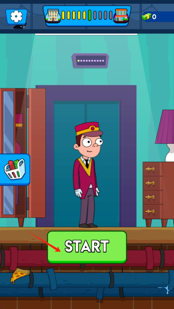 1、在游戏启动界面,点击START,开启电梯模拟的趣味挑战,点击按钮开始游戏。