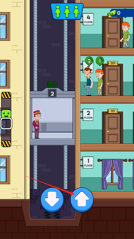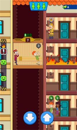 2、游戏中,根据人物所在楼层,点击上下按钮,精准控制电梯移动,安全运送人物,点击传送电梯。