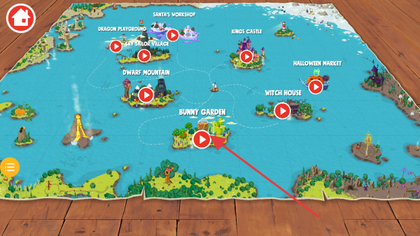 3、游戏地图中有多个不同场景,如BUNNY GARDEN等,每个场景旁有红色播放按钮,点击对应按钮可进入该场景进行游戏探索。
