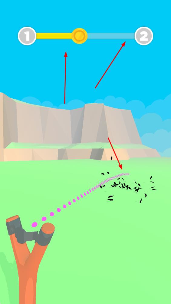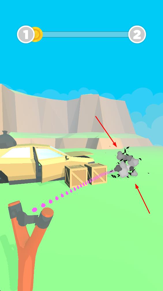 2、利用弹弓发射弹丸,击中场景中的物体和敌人,获取分数和奖励。