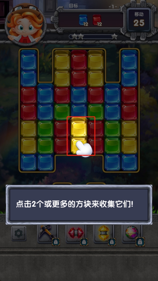 1、游戏开局时按提示点击2个及以上同色方块,像红色框内黄色方块,触发消除收集对应颜色宝石。