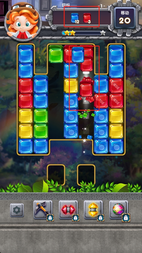 2、消除时关注上方目标,蓝色需12个、红色需3个,优先消除目标颜色方块,借助连锁消除。