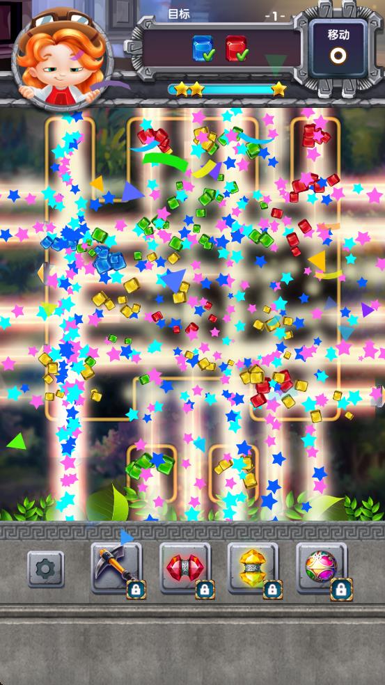 2、障碍破解策略:面对被藤蔓缠绕的宝石,需消除其周围的宝石解除束缚,遇到石块障碍,需用爆炸宝石的冲击波摧毁,逐步清理障碍推进关卡。