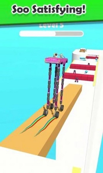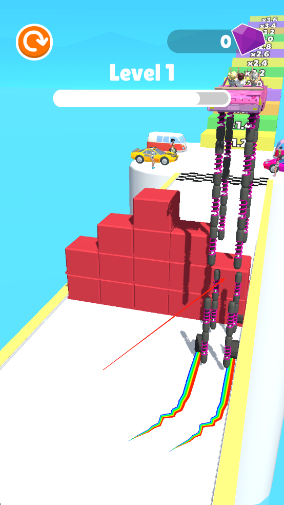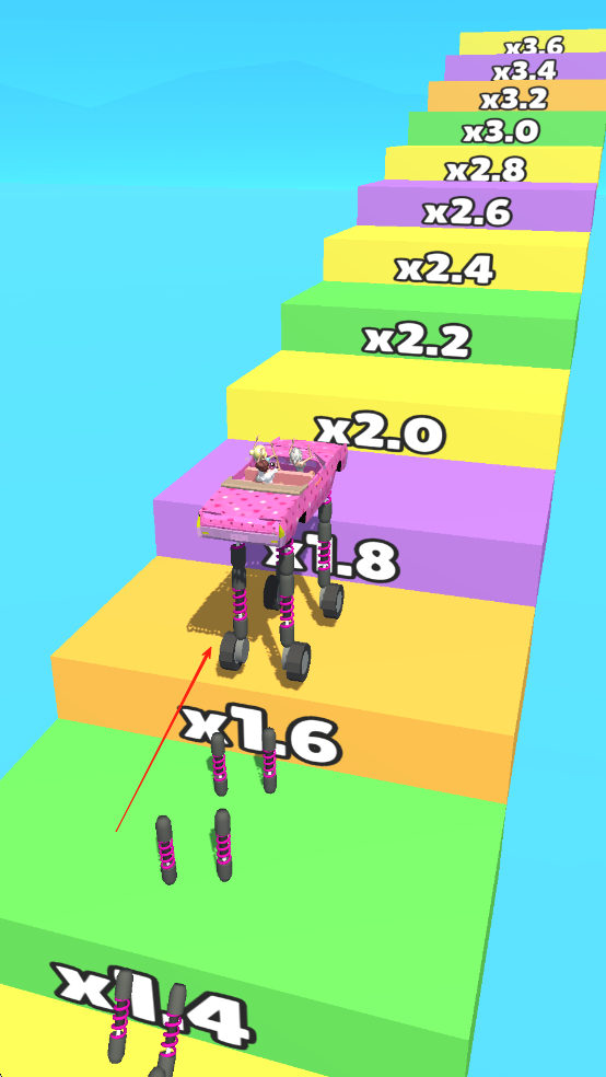 3、到达终点后剩余的轮子会开上阶梯,每上一层截掉一点轮子直至车辆到达平地,获得最终奖励。