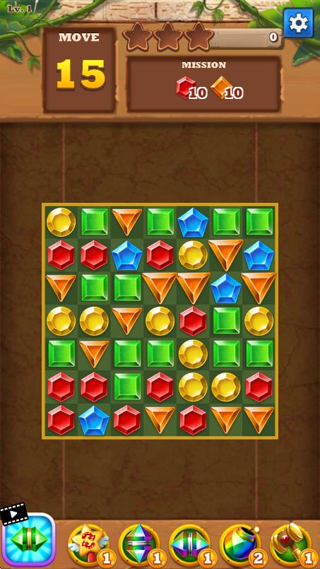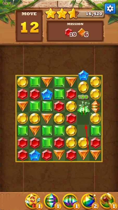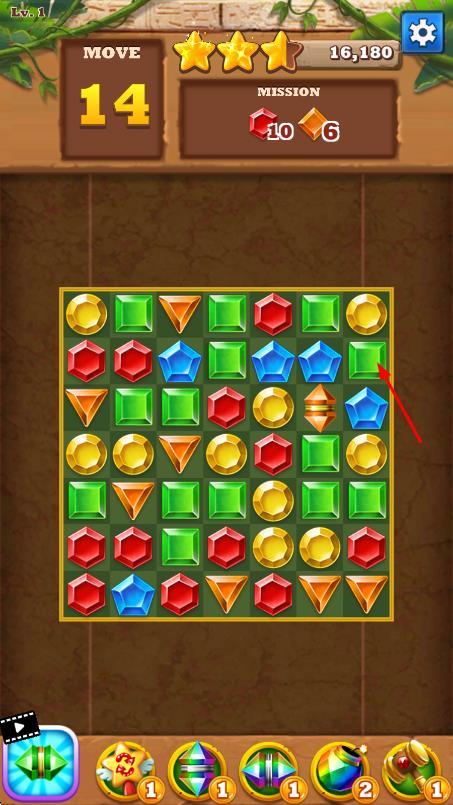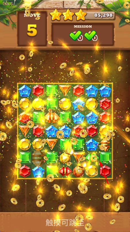1、进入游戏后,观察关卡中宝石布局,点击或滑动屏幕,将三个及以上相同颜色的宝石移动到一起进行消除,获取初始积分。