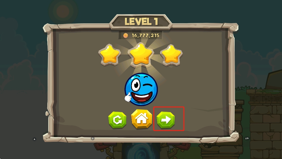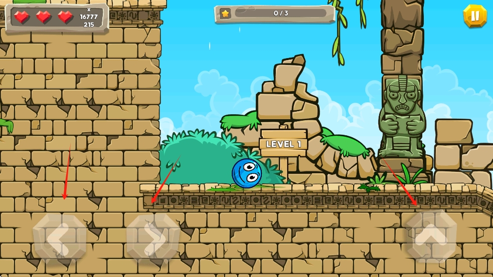 1、操控蓝色球形角色,利用左下方向键移动,右下跳跃键跨越障碍,沿石路前进,收集星星和金币。