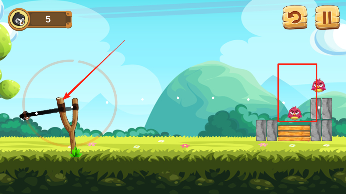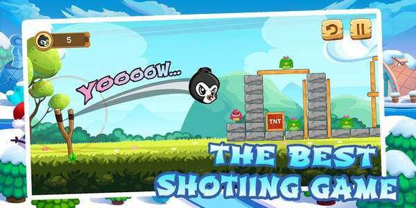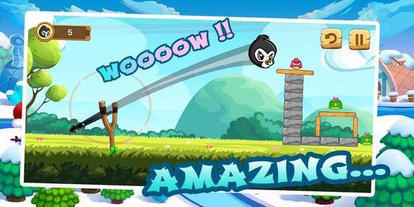 2、拉动弹弓瞄准小鸟,调整弹射角度与力度,发射企鹅击中目标小鸟,破坏其防御,体验精准射击机制。