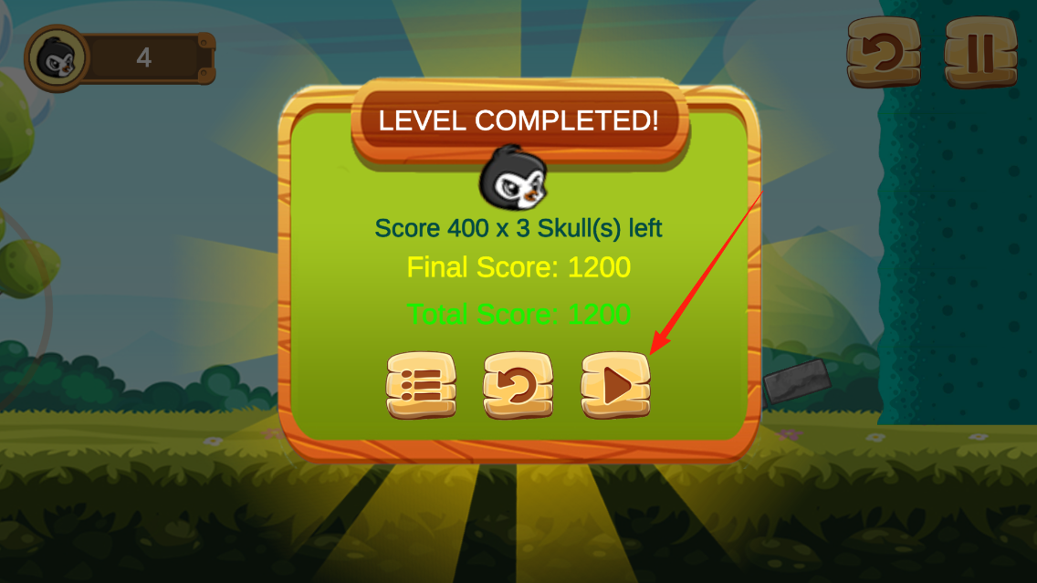3、点击三角形按钮进入下一关,查看当前关卡得分延续弹射挑战,解锁新场景,体验关卡推进玩法。
