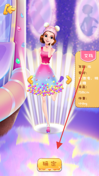 2、在角色选择界面,选择名为艾玛的角色,她今年16岁,身高158cm,体重44kg,喜好为冲浪和棉花糖,点击确定按钮即可选定该角色。