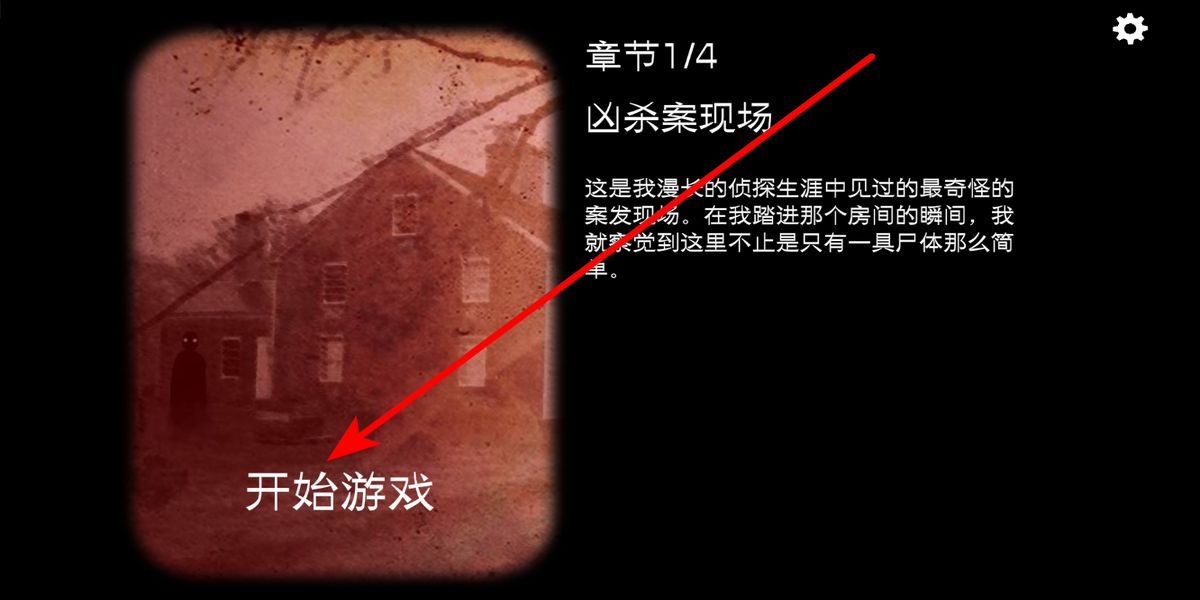 1、点击开始游戏,在游戏界面找到开始游戏按钮并点击,界面会显示章节相关介绍,如章节四分之一凶杀案现场等内容,随后进入游戏场景开启冒险。