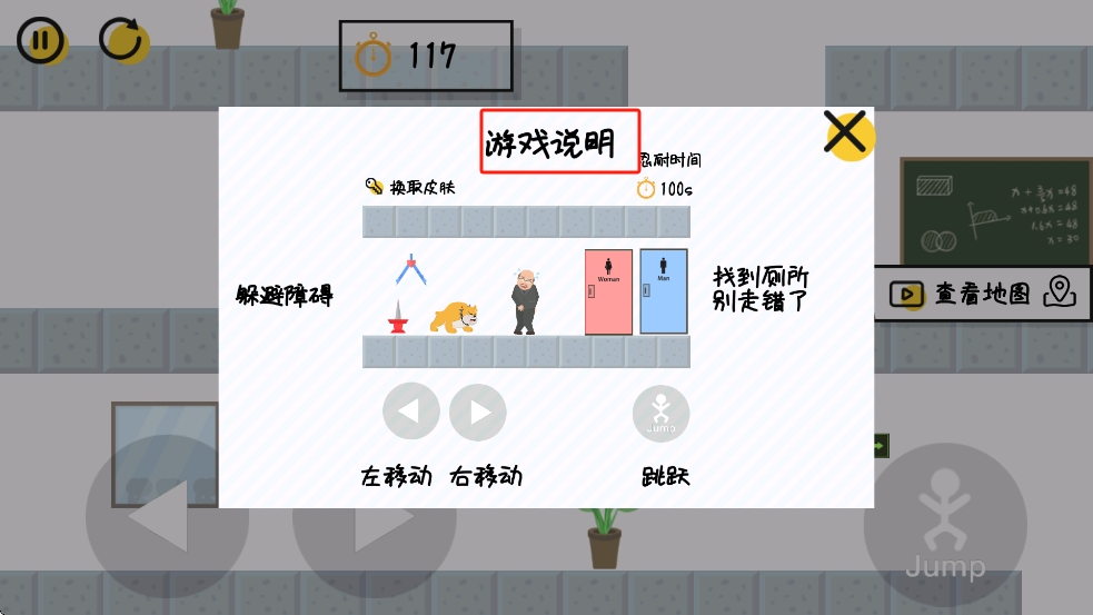 1、开局查看游戏说明,明确需操控角色躲避障碍,在100秒内找到对应性别厕所,利用左右移动和跳跃按键行动。