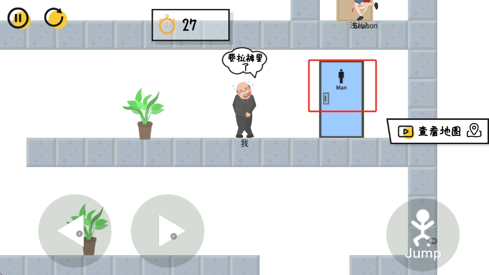 2、游戏时留意时间剩余27秒,角色显示要拉裤里了,快速移动避开植物,朝右侧标有Man的男士厕所前进。