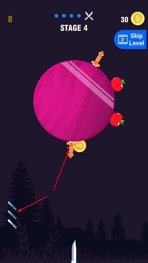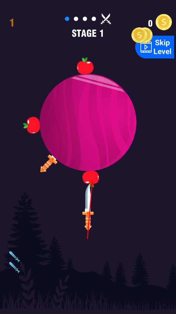 3、精准投掷避碰撞:玩家需将刀子扔进旋转转盘中,必须注意时间与时机,避免触碰已有刀具或刺伤,这种精准投掷的设定考验操作的细腻度,让每一次成功插入都充满满足感。