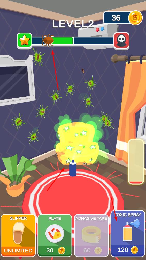1、蟑螂狡猾增加挑战:蟑螂并不脆弱且十分狡猾,难以消除,它们的移动与躲藏方式增加了消灭难度,让玩家在击杀过程中需要更专注,提升了游戏的挑战性与趣味性。