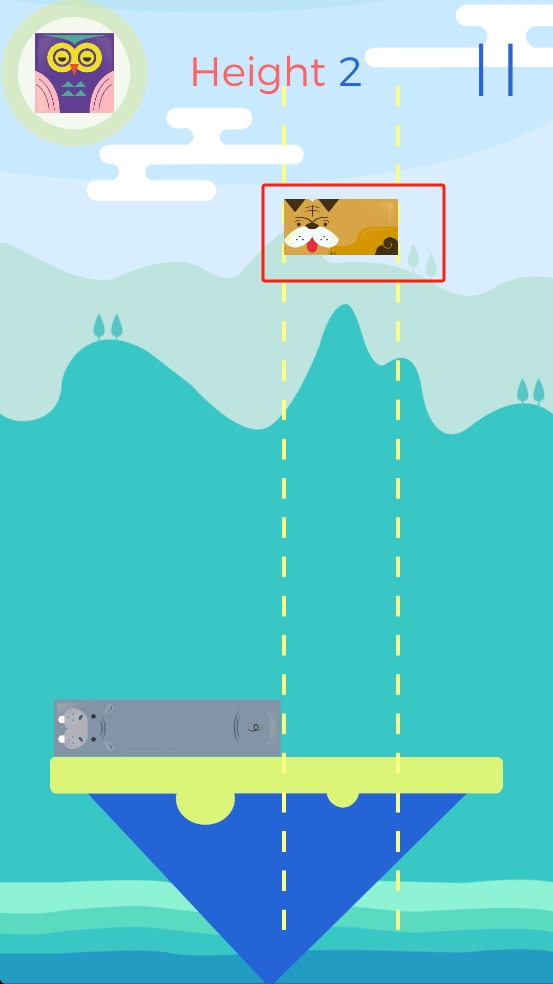 2、留意空中带老虎图案的方块下落轨迹,结合下方平台,调整方块位置,让其精准堆叠。