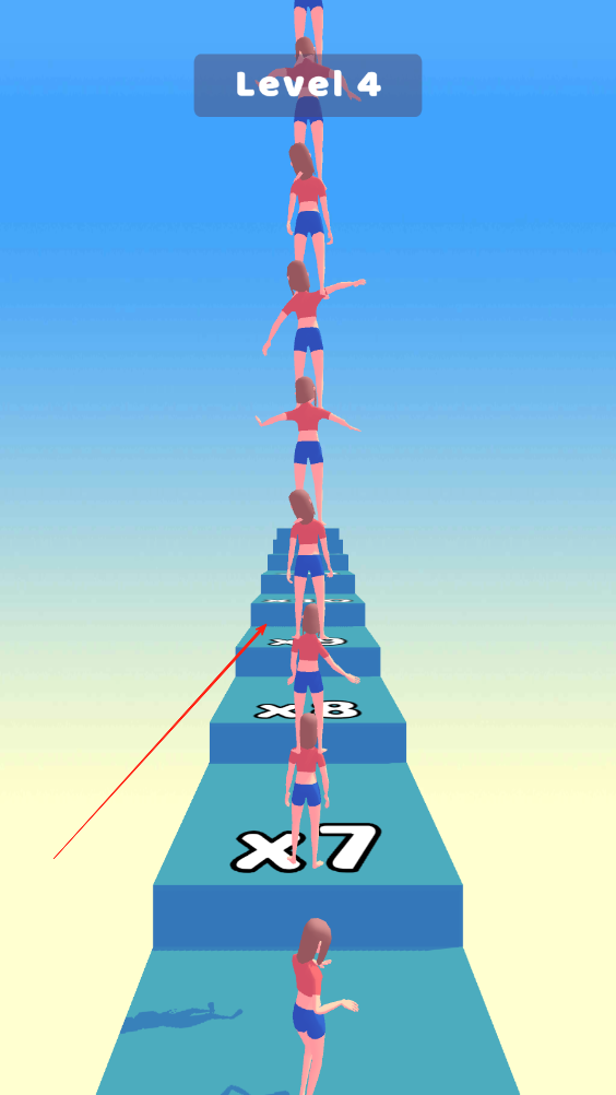 3、小人带着剩余队友成功抵达关卡终点,人塔上的人都会被分到前方阶梯上,人数越多获得的翻倍奖励越丰厚。