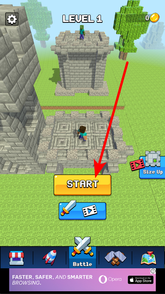 1、点击开始游戏,进入游戏界面后,找到并点击标有开始的黄色按钮,开启第一关游戏之旅,利用搭建的基地,准备迎接战斗挑战。