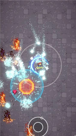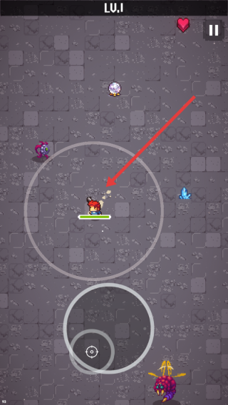 2、关卡内用虚拟摇杆移动角色,靠近怪物自动攻击,留意血量,躲避敌人攻击、收集道具,推进LV.1进程挑战怪物。